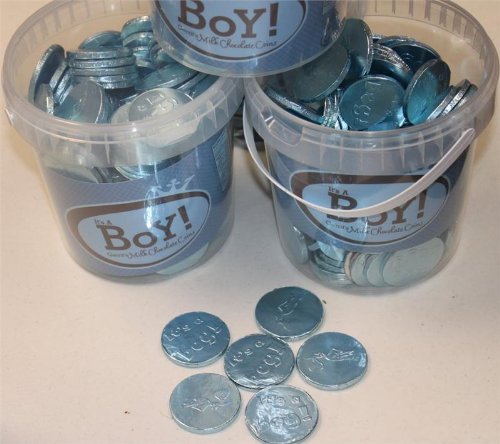 - Unique and delicious milk chocolate coins imported from Switzerland. Each coin is wrapped with blue sturdy foil, easy to open with the message "It's a Boy" on one side and a stork on the other side. Nice Bucket of 144 pieces, Each is 1.5 inch in diameter.