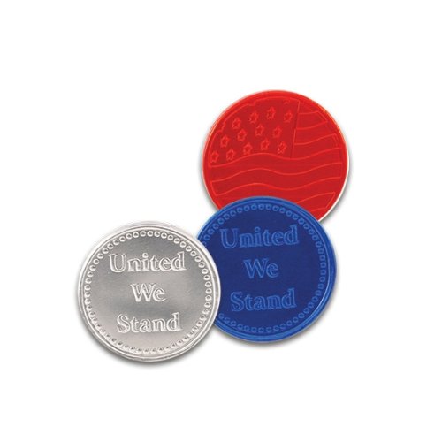 56 1.5" Milk Chocolate Coins in red, silver & blue foil with "United We Stand" message embossed on them.