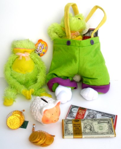 Felt Fabric Overalls Pants Easter Bag Basket With Ceramic Holiday Piggy Bank, 2 Million Dollar Chocolate Bars (Milk & Dark Peppermint Crunch) & Bag Of Milk Chocolate Coins And Plush Frog Stuffed Animal Review