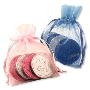 4 milk chocolate coins embossed with "It's A Boy" message. Packaged in a soft blue chiffion Pouch