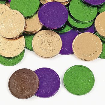 Mardi Gras Chocolate Coins. This yummy money will add some Louisiana spirit to your Mardi Gras parade or party! These green gold and purple candy coins are perfect for tossing in goody bags or throwing from a float. Individually foil-wrapped. (68 pcs. per unit 1 lb.)